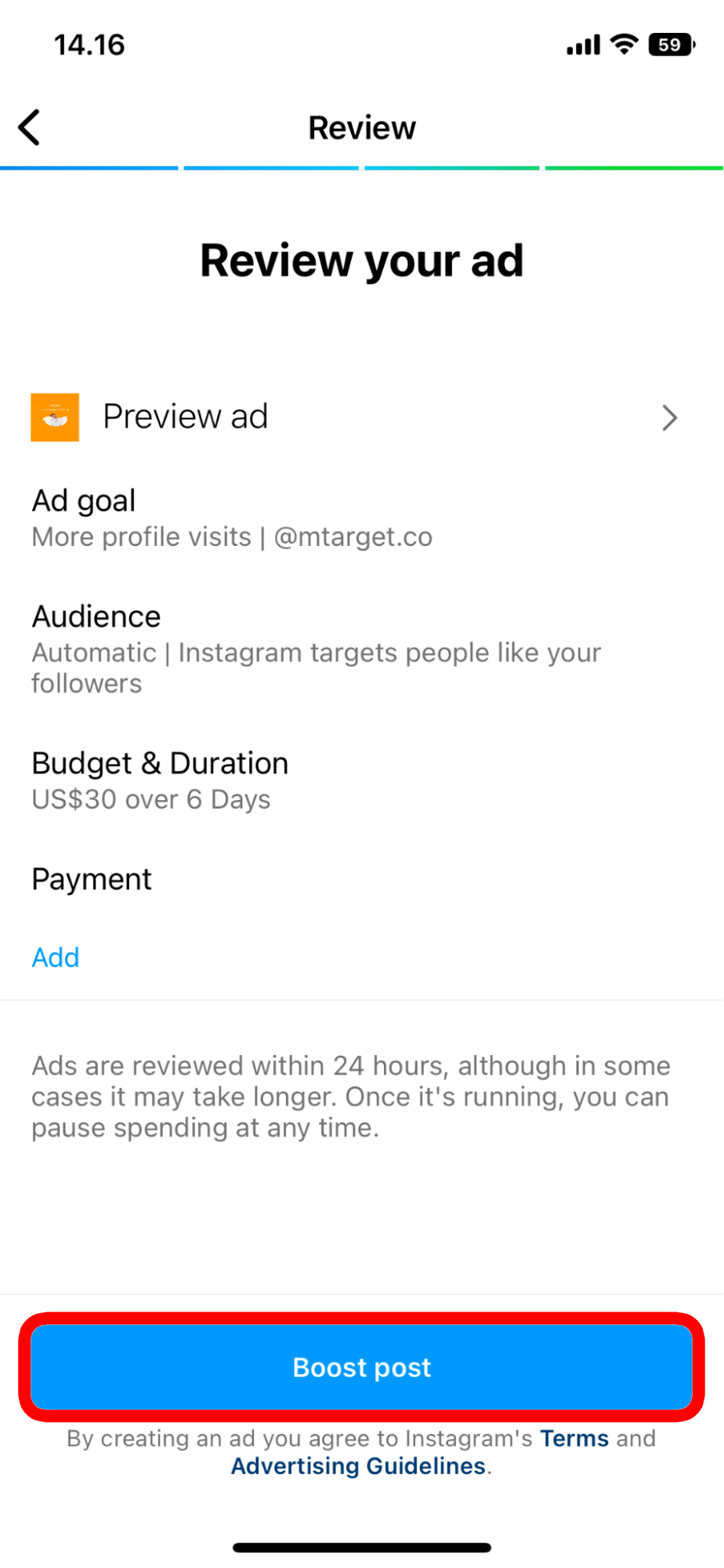 Jika Anda sudah yakin dengan video Reels, target audiens, dan seluruh ad format yang sudah Anda isi sebelumnya, tekan tombol Boost Post. Setelah itu Instagram akan melakukan review pada Ads Anda. Dalam waktu paling lambat 24 jam, iklan Anda akan live ketika Instagram sudah selesai melakukan review. Jika tidak lolos review iklan Anda tidak akan berlanjut.