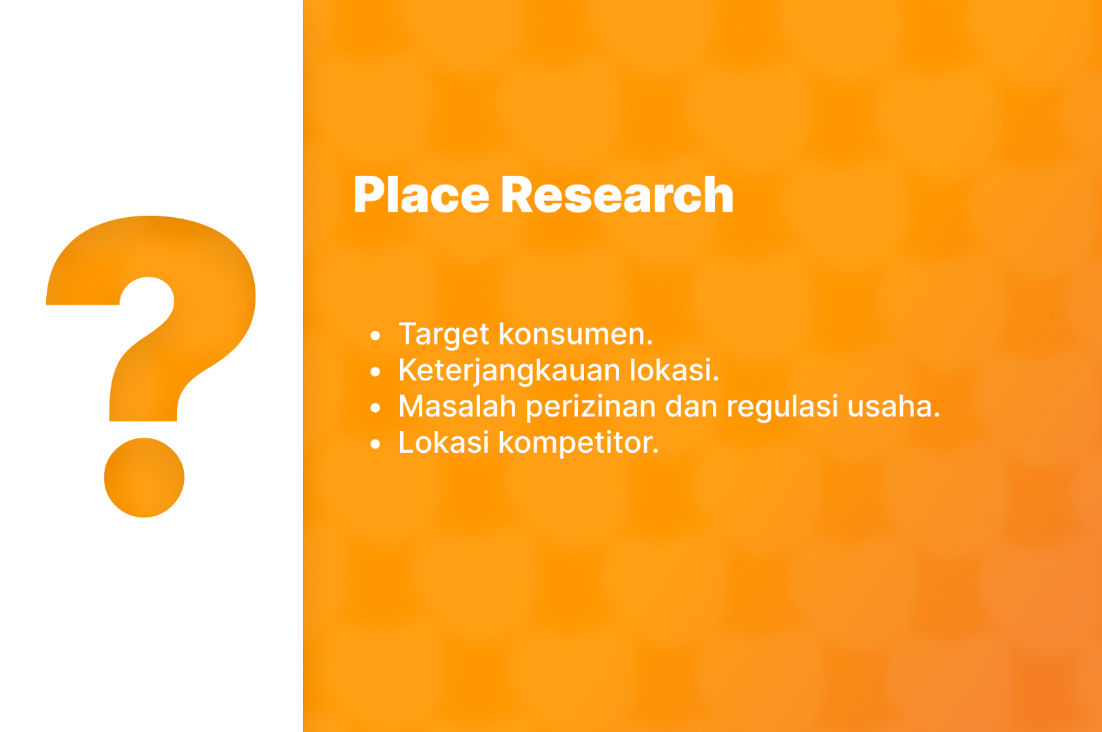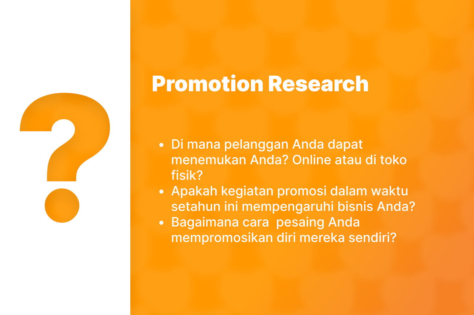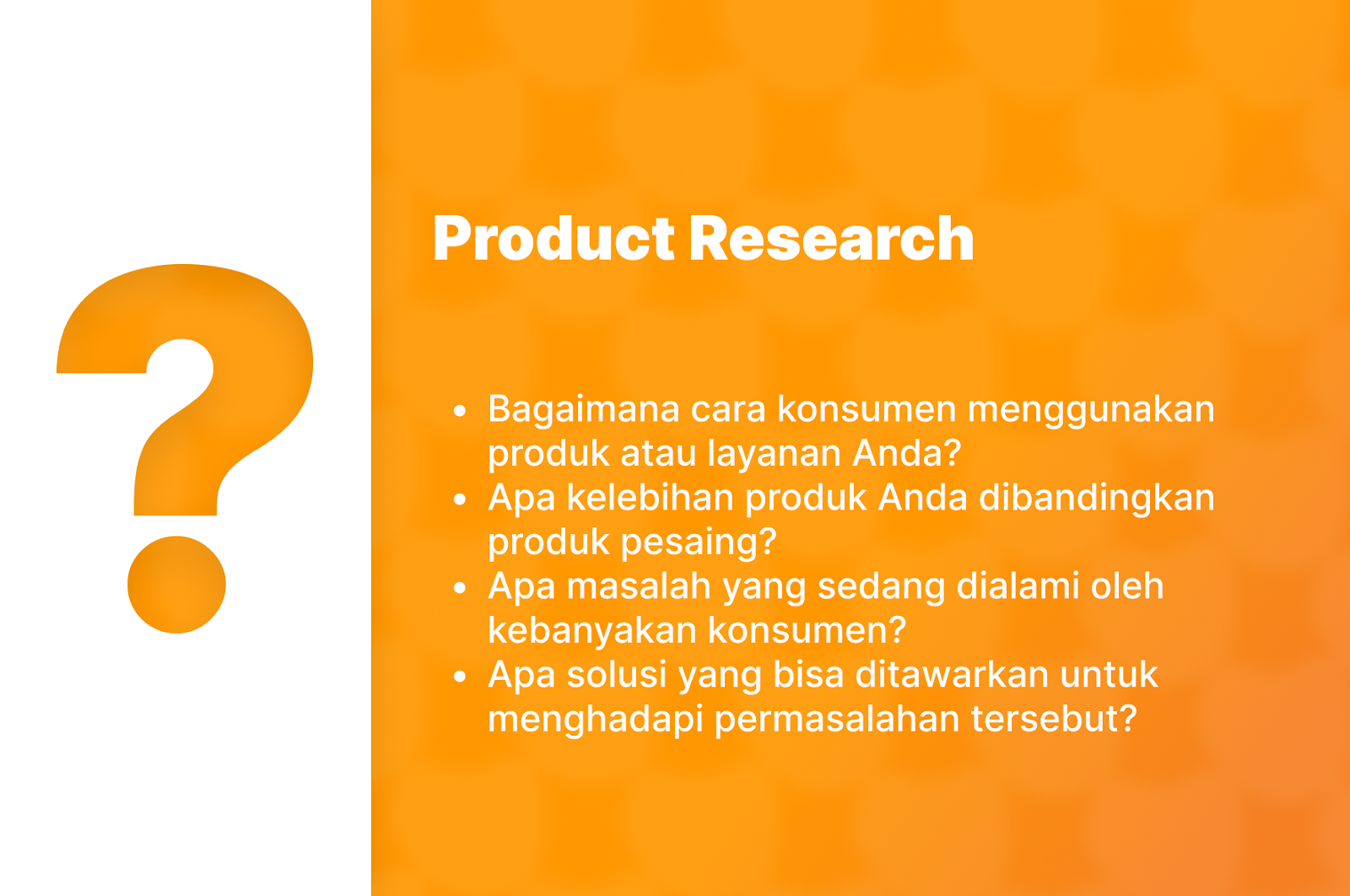Jika, pelanggan Anda tidak puas dengan apa yang Anda jual, mereka tidak akan kembali kepada Anda. Tetapi jika kualitas produk Anda bagus dan itu menghasilkan solusi, maka produk Anda akan diminati dan terjual dengan sendirinya. Berikut ini beberapa contoh pertanyaan di bawah ini bisa Anda gunakan untuk membantu Anda melakukan riset pasar: