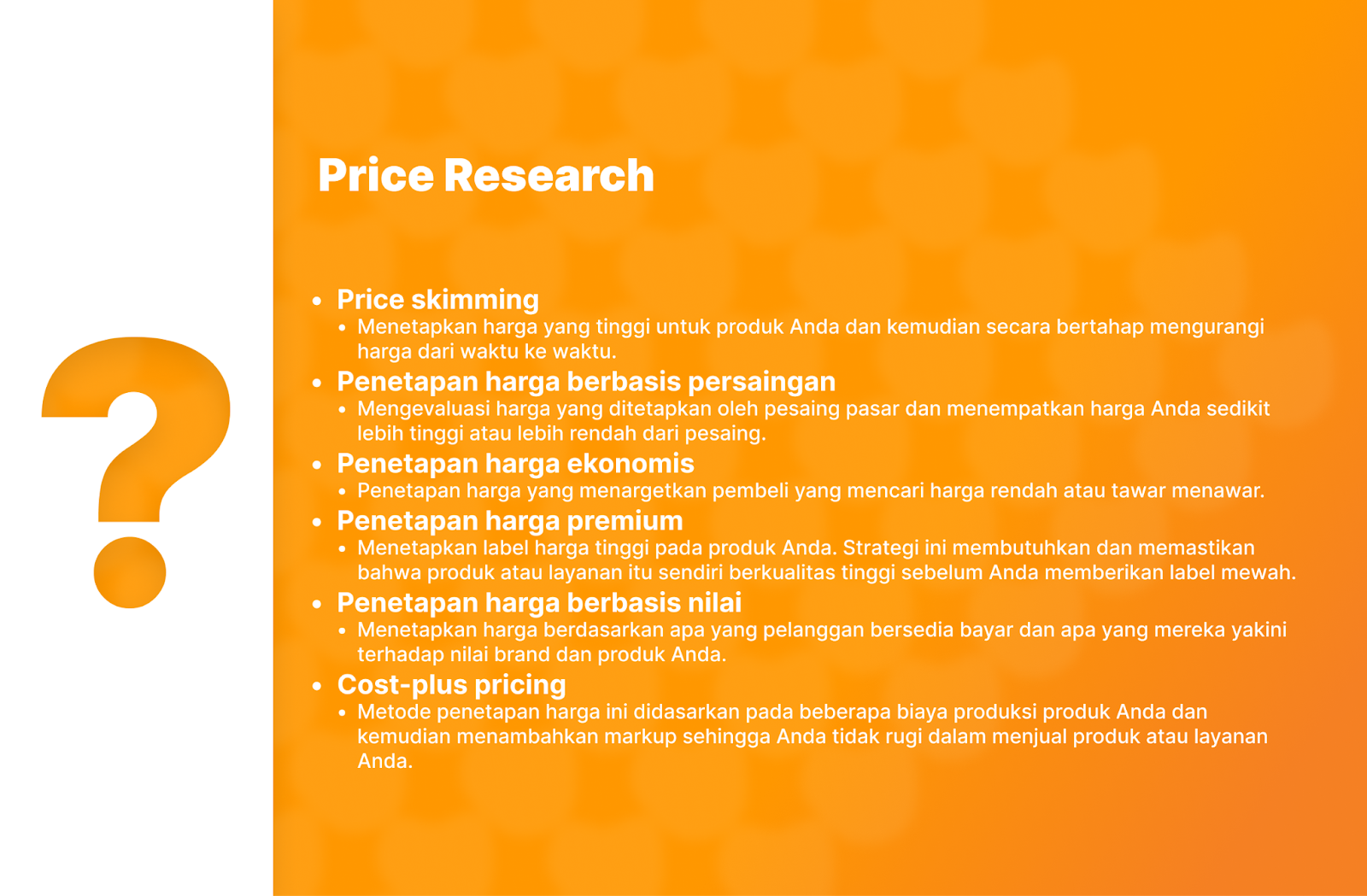 Apapun jenis strategi penetapan harga Anda, pastikan bahwa hal tersebut sejalan dengan brand Anda, tentukan harga yang bersedia dibayar oleh pelanggan Anda dan dapat menghasilkan keuntungan.