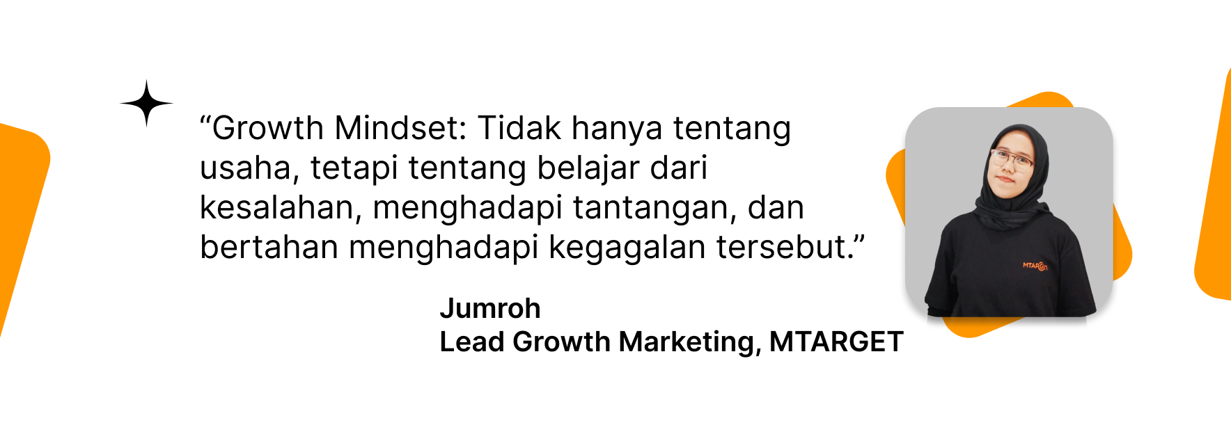Sesuatu tentang growth mindset ini saya pelajari perlahan ketika saya masuk di MTARGET, yang mana team member dan team leadernya ternyata memiliki pemikiran yang sama yang mengarah kepada growth mindset. Orang-orang yang cenderung tidak mudah menyerah dan memiliki keinginan belajar dan mengembangkan diri lebih dari sebelum-sebelumnya.