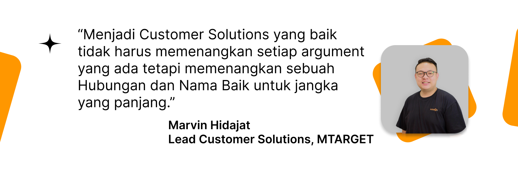 Di MTARGET sendiri, kami menyebut tim kami sebagai tim Customer Solutions. Dan sebagai representative MTARGET untuk public, role utama dari tim Customer Solutions adalah membantu customer dengan menjadi pemberi solusi atas masalah yang mereka hadapi, dan memberikan pengalaman terbaik kepada customer dengan perusahaan, karena kami adalah jembatan antara perusahaan dengan customer.