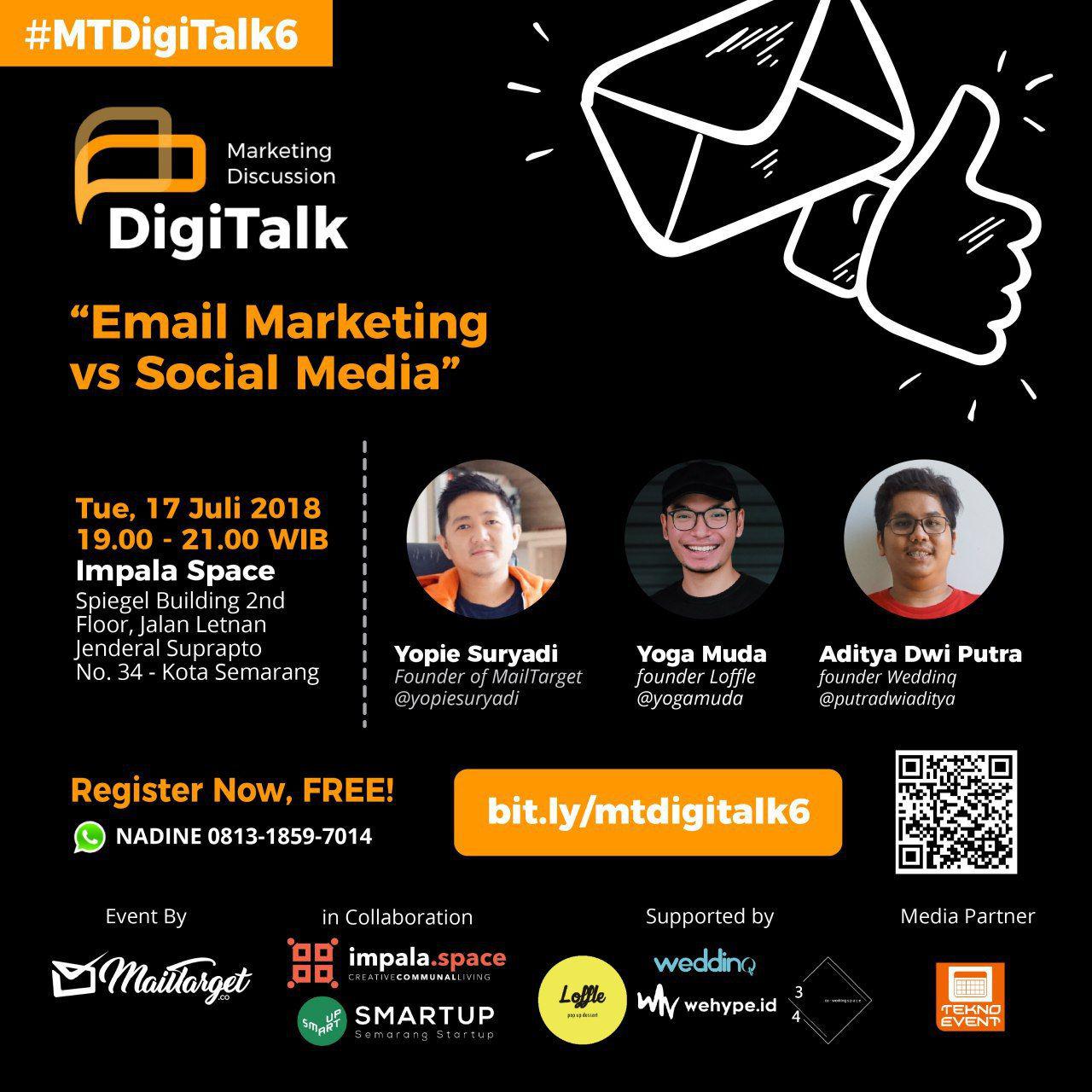 Selasa, 17 Juli 2018 yang lalu, event DigiTalk Vol. 6 sukses diadakan di Impala Space dari pukul 19.00 WIB hingga 21.00 WIB, dengan tema Email Marketing vs Sosial Media. Event ini dikemas dalam bentuk talkshow, sehingga sesi sharing, diskusi dan tanya jawab mendapatkan porsi yang besar.