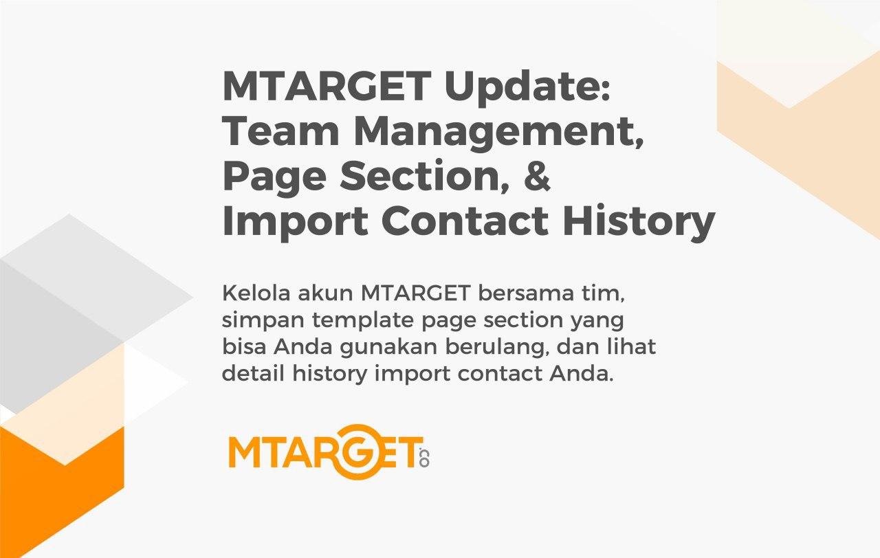 Update: Dapatkan Kemudahan mengelola akun MTARGET Bersama Team Updates | 26 Mei 2020 Kelola akun MTARGET bersama tim, simpan template page section yang bisa Anda gunakan berulang, dan lihat detail history import contact Anda.